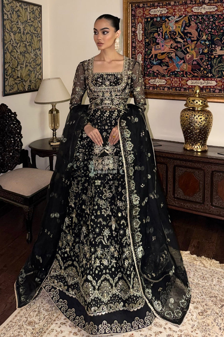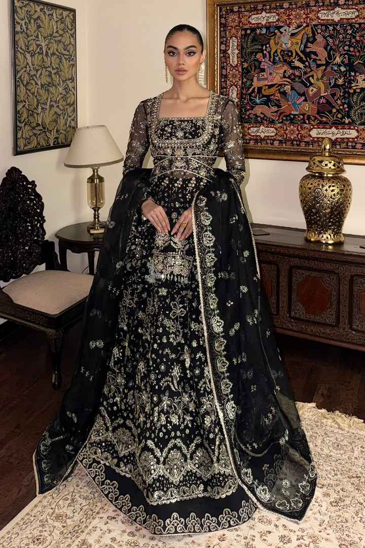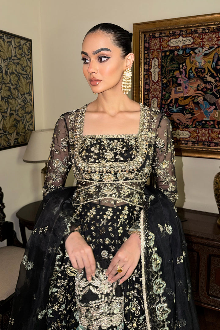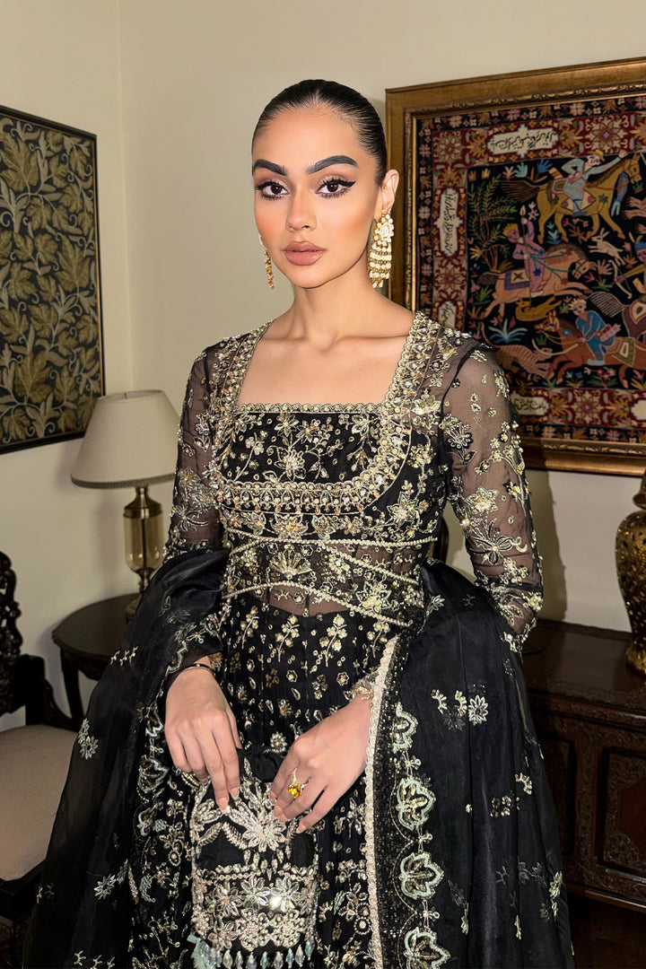 Novera — a regal ode in black, where a fourteen-kali pishwas unfurls in sweeping drama, cinched with a waist belt to shape its majestic silhouette.