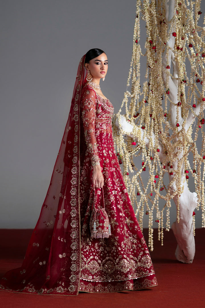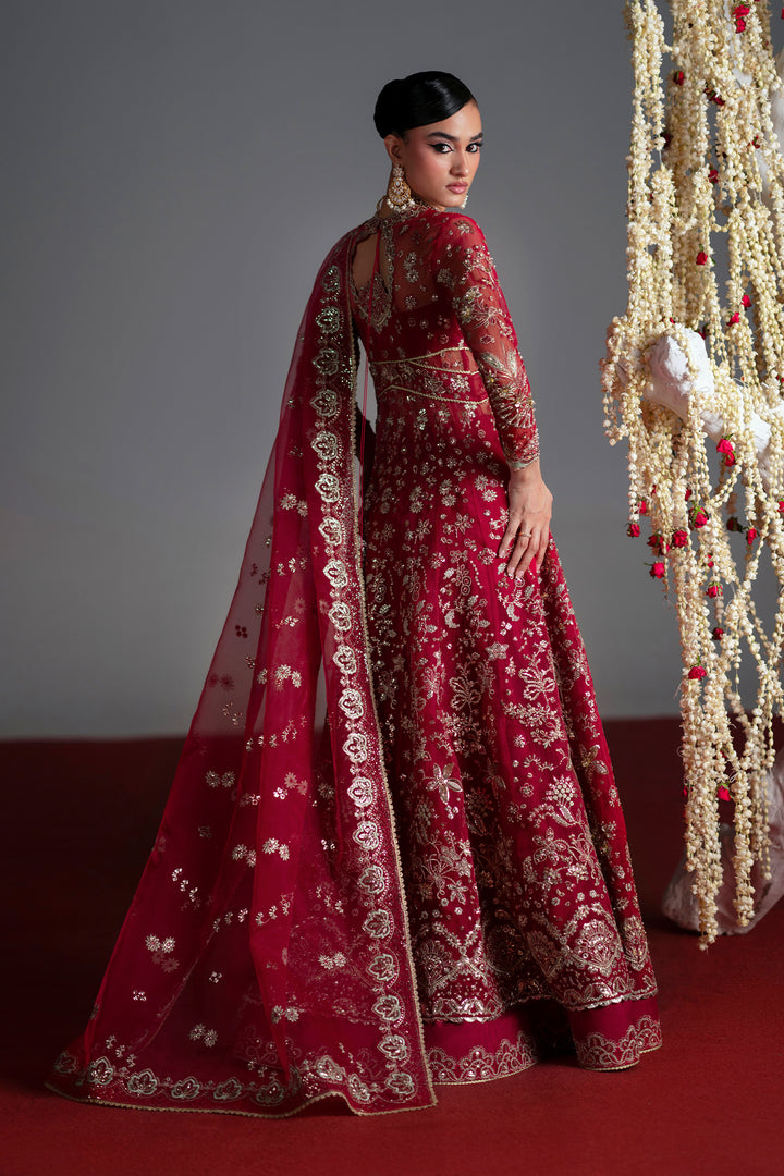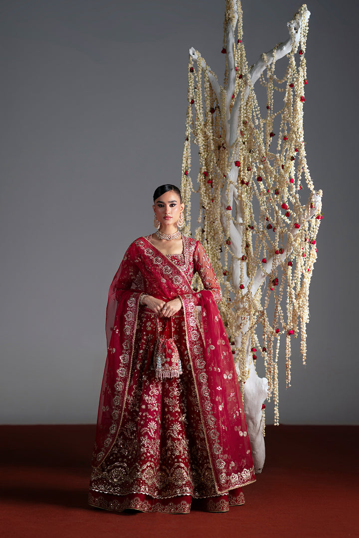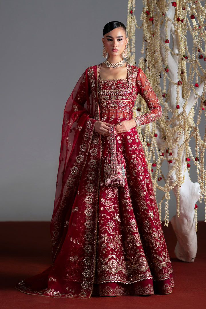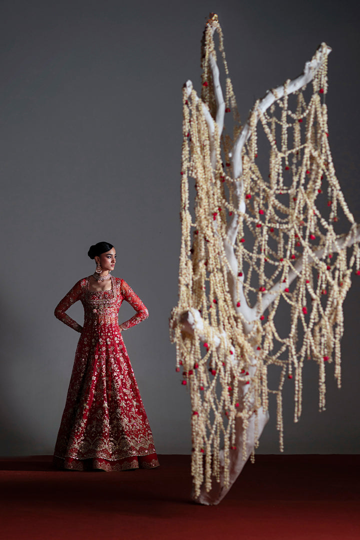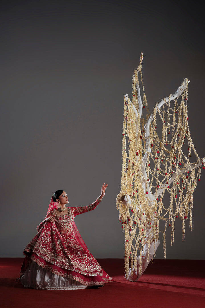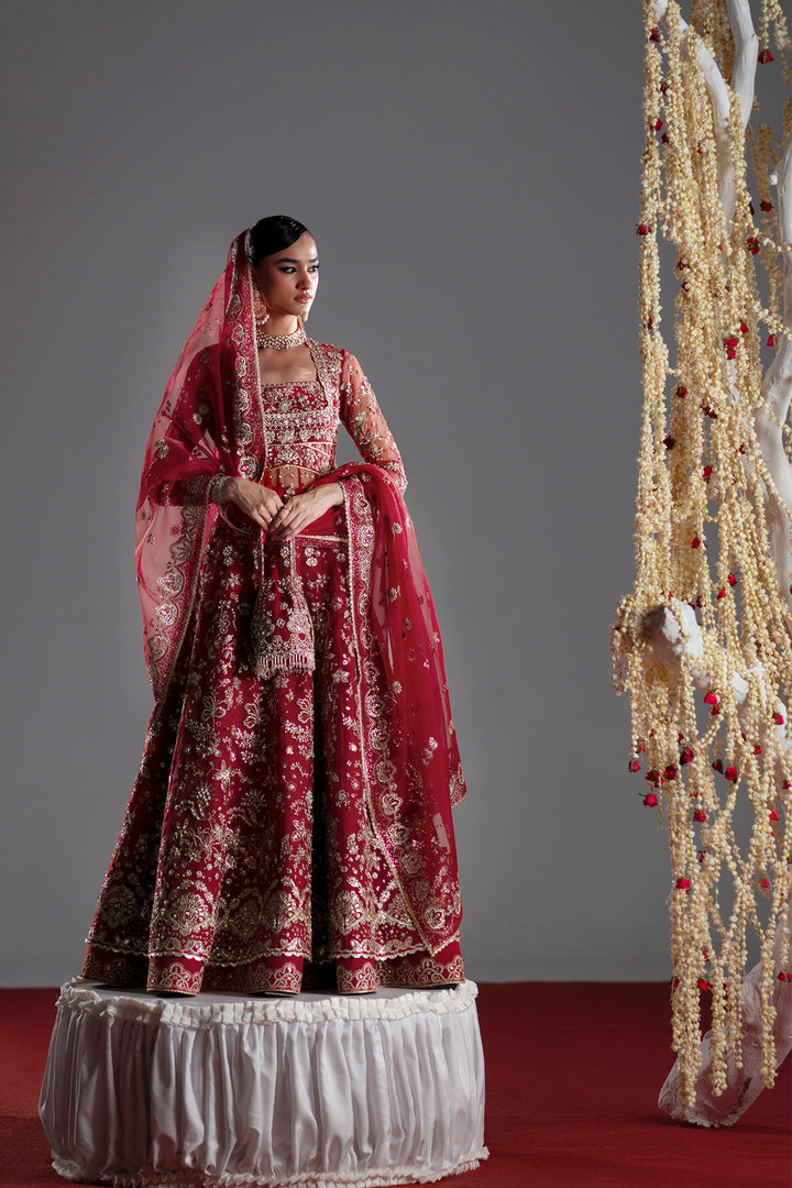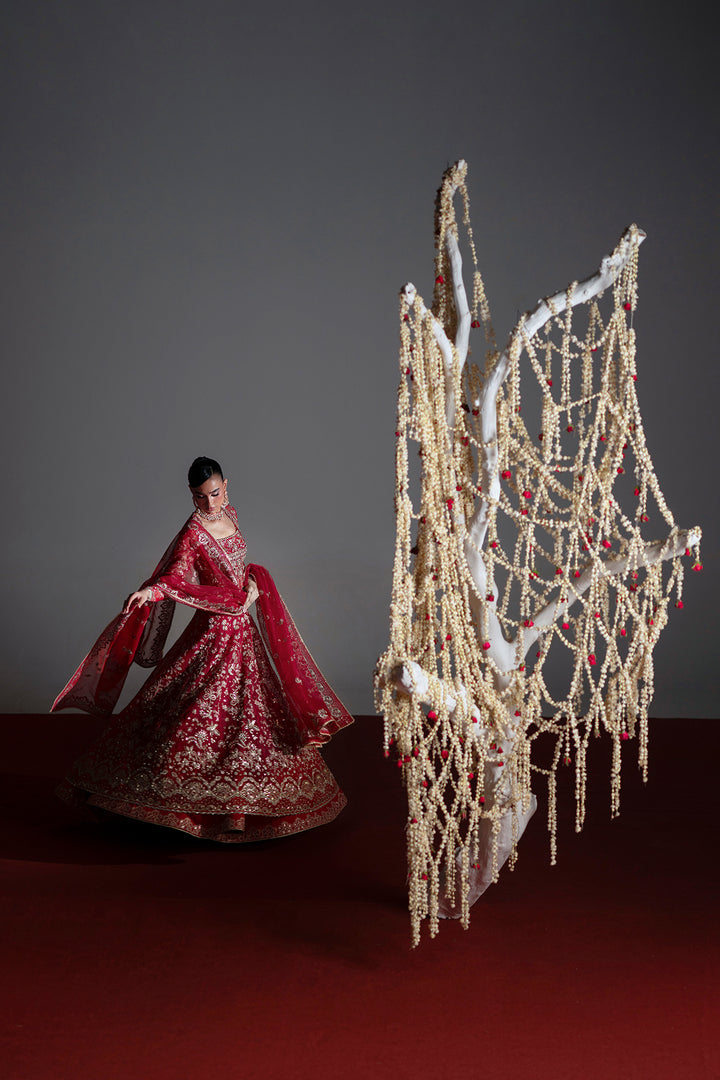 𝐑𝐨𝐬𝐞𝐥𝐲𝐧 — a regal ode in red, where a fourteen-kali pishwas unfurls in sweeping drama, cinched with a waist belt to shape its majestic silhouette.